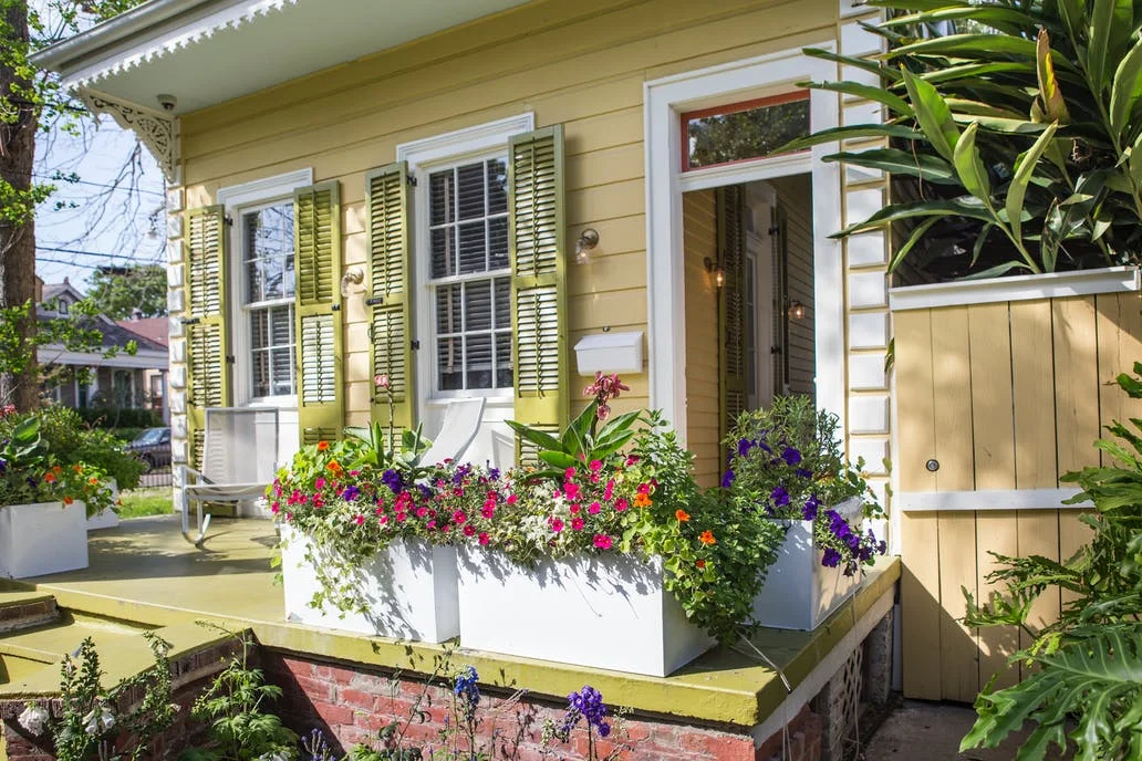 “Lush tropical plants and flower boxes bursting with color fill the entrance to the Shaya home with life. Local designer Niki Epstein keeps their flower boxes looking fresh. Emily and Alon have maintained the previous owner's exterior color palette.”