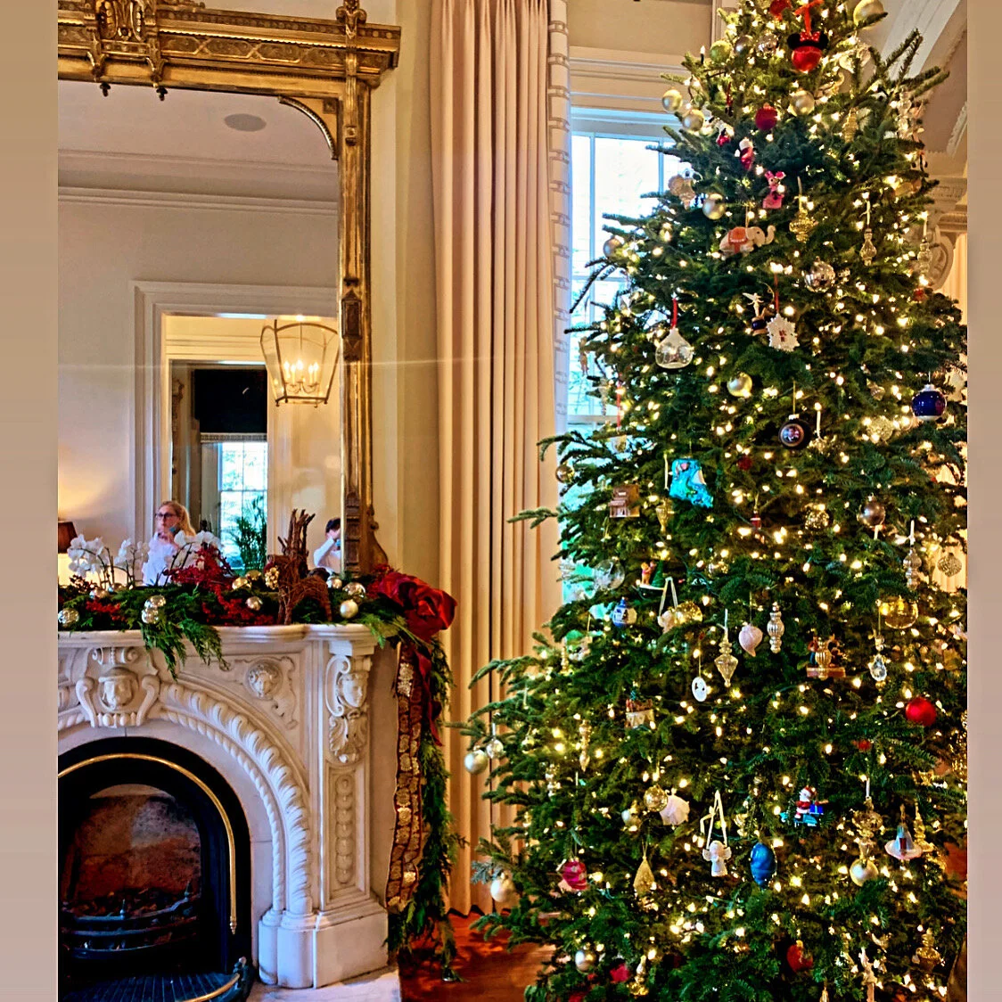 “In selecting the flowers and greenery, Colhoun and the designers had to consider the home’s location: right alongside Audubon Park. “When the backdrop is ancient live oak trees, you can’t compete with that,” says Epstein. They kept it simple and local—and strictly green and white—using cedar, magnolia, and camellia foliage with white peonies, ranunculus, scabiosas, amaryllis, astrantias, roses, variegated white-and-green kale, and parrot tulips. These cedar garlands are hung from nails painted white and driven into the top corners and center of each window frame.”